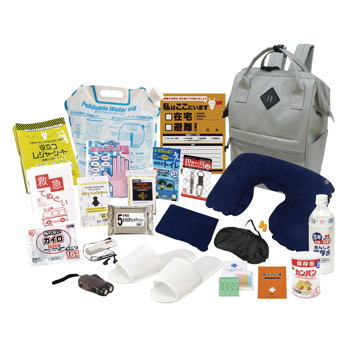 付属品、セット内容: 収納リュック・IDホイッスル&カラビナリング・ウエットティッシュ(日本)・アルミブランケット・防災の心得(日本)・ダイナモLEDライト・綿棒&絆創膏(タイ・日本)・5年保存水500ml(日本)・カンパン(日本)・カイロ(日本)・レインコート・携帯用トイレ・FMラ