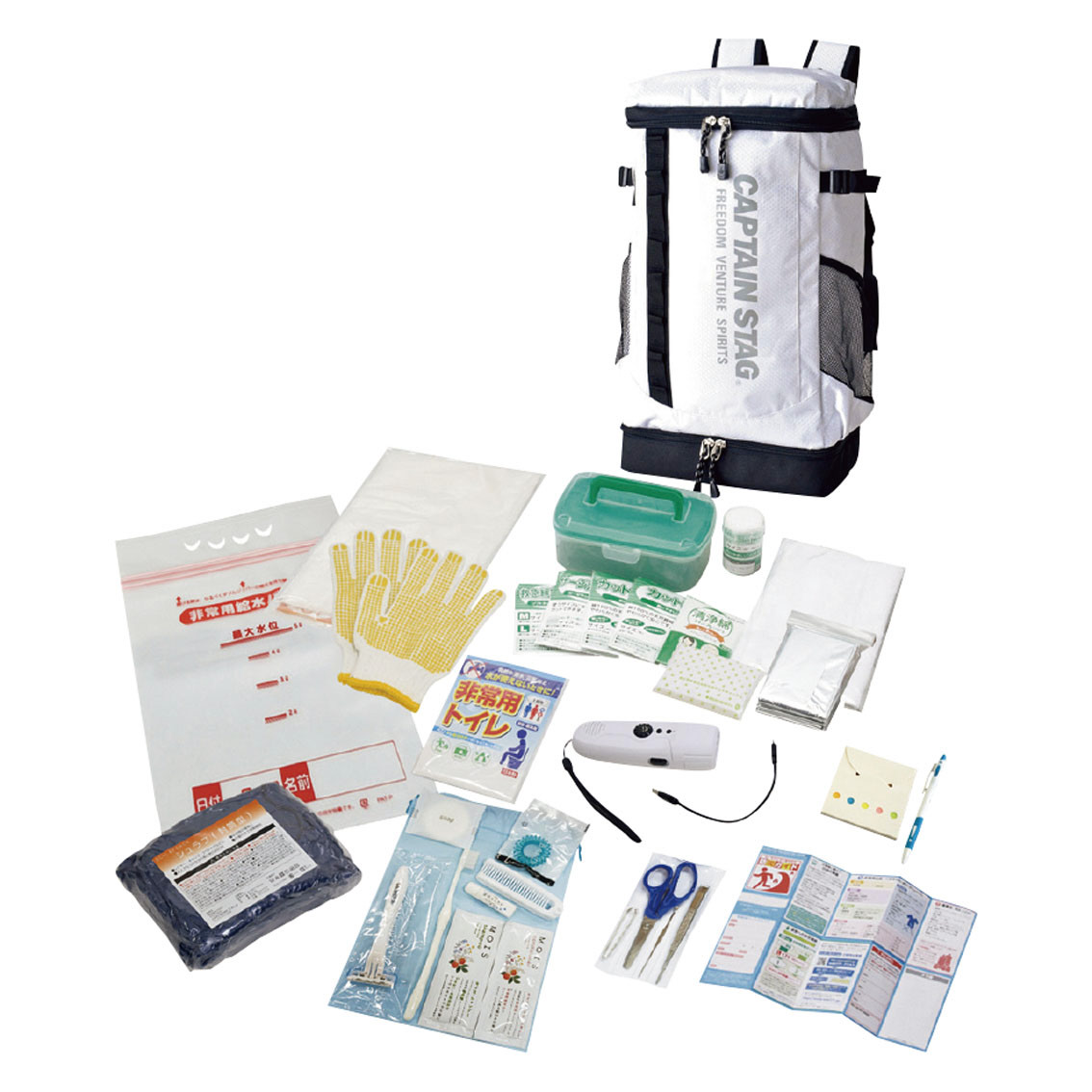 付属品、セット内容: リュック・スマホ対応ダイナモFMラジオLEDライト・非常用給水バッグ・防寒シート・すべり止め手袋・非常用トイレ・シュラフ・ゴミ袋45L10枚・救急箱・カット綿×3・カットガーゼ×3・包帯・救急絆創膏2サイズ×3・サージカルテープ・洗浄綿2枚入×3・ハサミ・ピンセット・