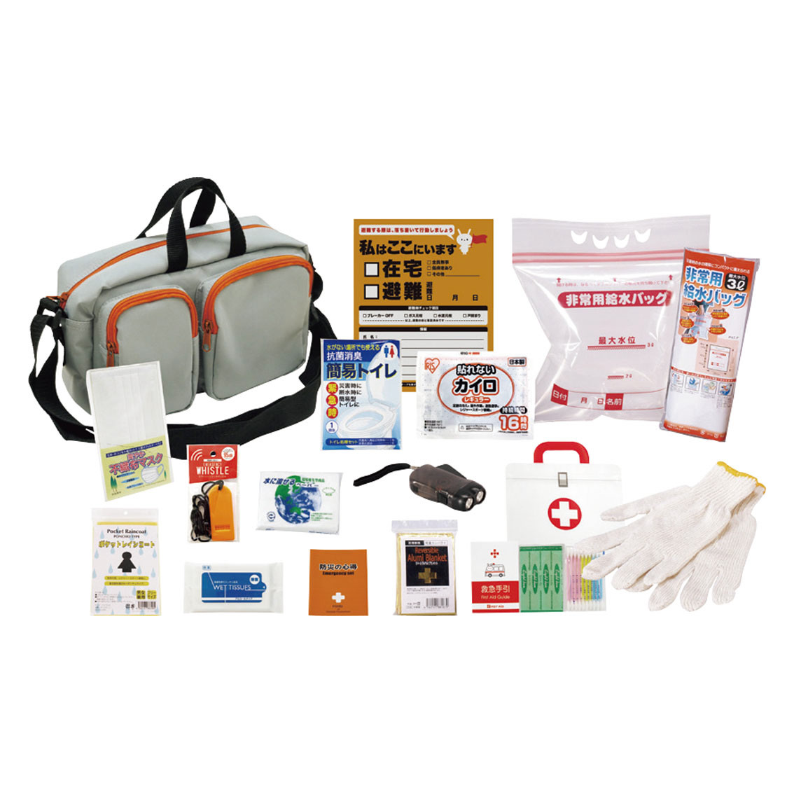 付属品、セット内容: 収納バッグ・ホイッスル・マスク・軍手(ベトナム)・アルミブランケット・防災の心得(日本)・ダイナモLEDライト・給水袋3L(タイ)・カイロ(日本)・レインコート・抗菌消臭簡易トイレ(中国・日本)・緊急避難カード(日本)・水に流せるペーパー(日本)・除菌アルコール