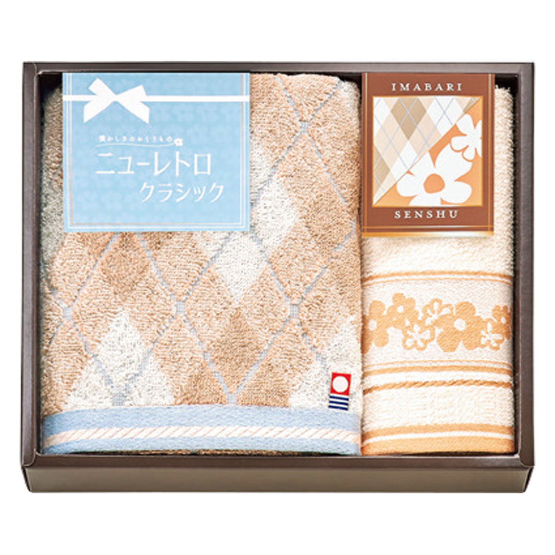 懐かしさのおくりもの少し懐かしい昭和感のあるデザインのタオルです。チェックと花柄のハイカラな柄のタオルと共に、懐かしい良きあの日のノスタルジックな想い出も贈ります。今治と泉州のタオルのセットで、2種類の使い心地を楽しめます。今治製のチェック柄のタオルは、ボ