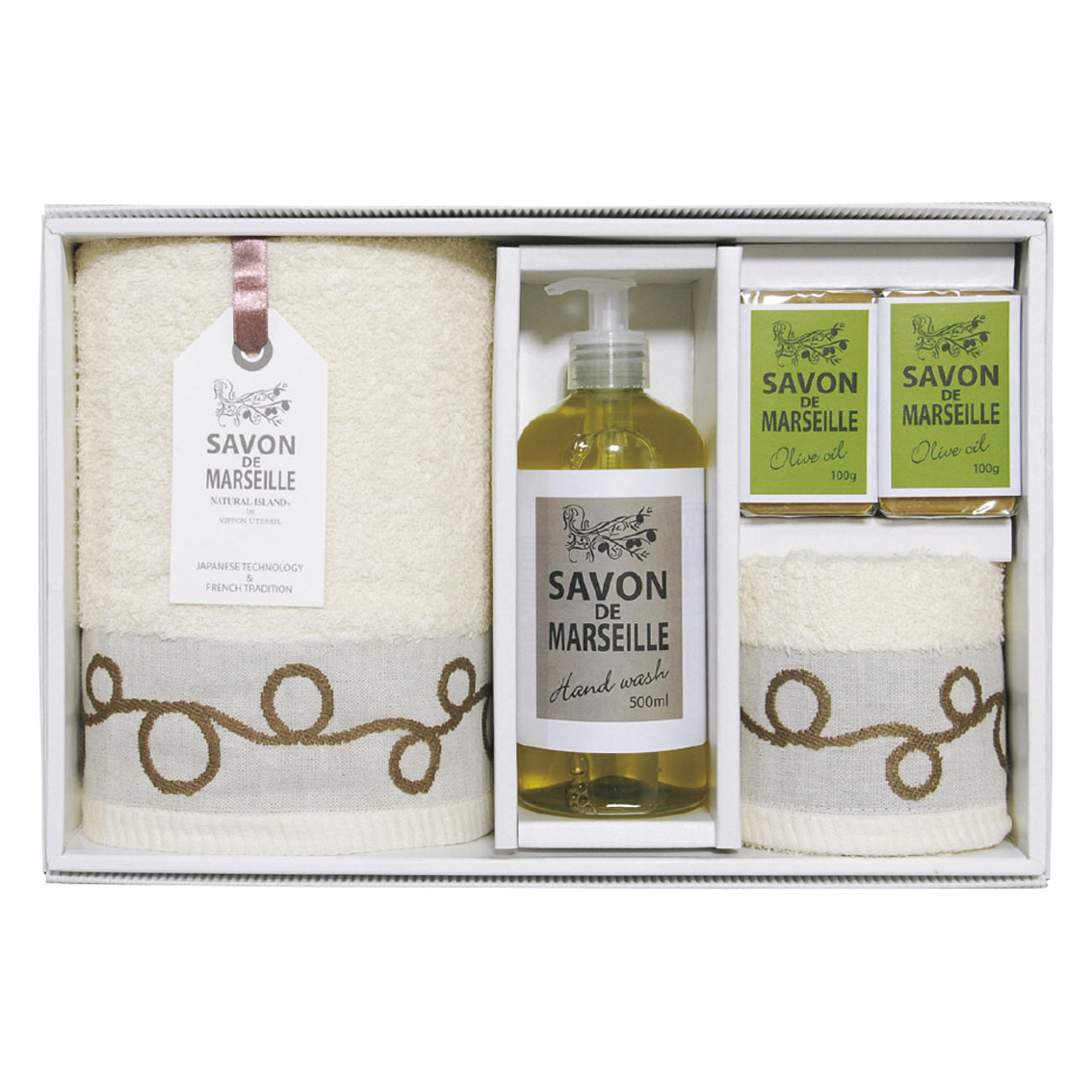 フランスのマルセイユで作られた植物性のソープと有機精練イソフラボンソフト加工を施した日本製のタオルを組み合わせた体や環境に優しいギフトです。