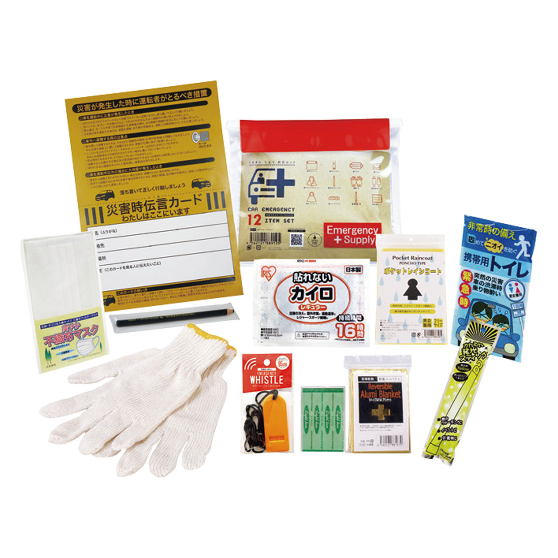 付属品、セット内容: 防水ポーチ・ホイッスル・マスク・軍手(ベトナム)・アルミブランケット・発光スティック・絆創膏5P(日本)・カイロ(日本)・レインコート・携帯用トイレ・ダーマト鉛筆・災害時伝言カード(日本)・取説