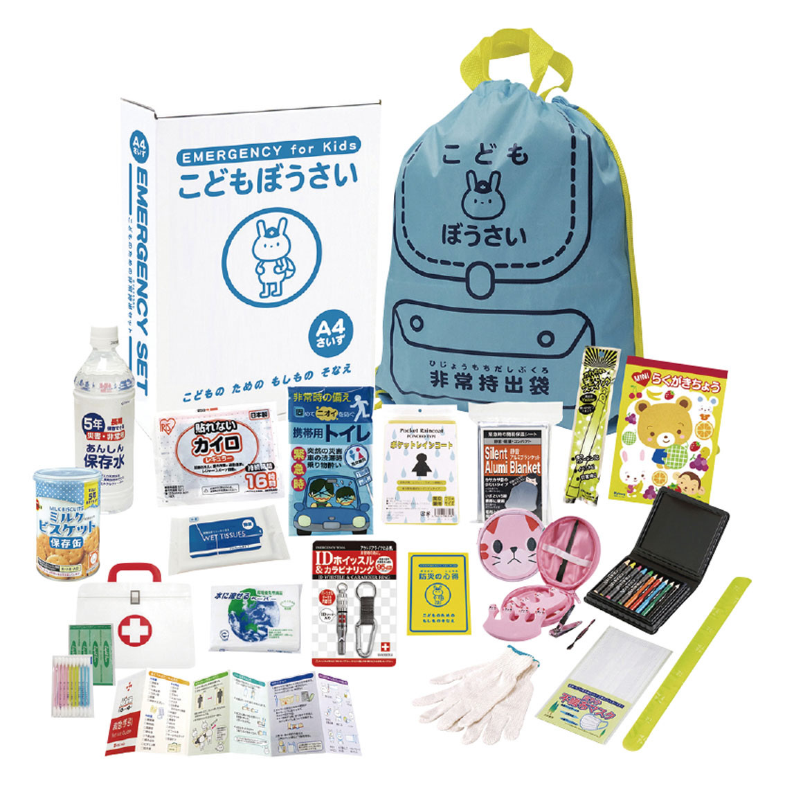 付属品、セット内容: 非常持出袋・反射リストバンド・落書き帳(日本)・アートセット・防災の心得(日本)・軍手・IDホイッスル&カラビナリング・カイロ(日本)・レインコート・携帯用トイレ・発光スティック・静音アルミブランケット・マスク・5年保存水500ml(日本)・ミルクビスケット(日本