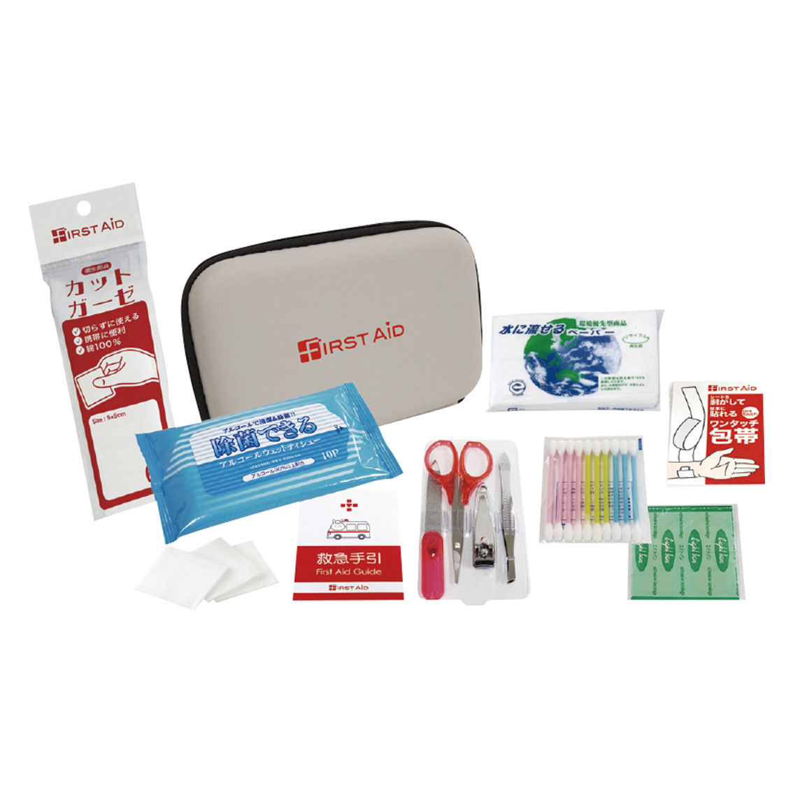 付属品、セット内容: 収納ケース・絆創膏5P(日本)・ワンタッチ包帯(日本)・コットンパフ3P(日本)・水に流せるペーパー(日本)・救急手引(日本)・カットガーゼ・除菌アルコールウェットティッシュ(日本)・綿棒10P(タイ)・爪切り・爪やすり・毛抜き・はさみ・取説