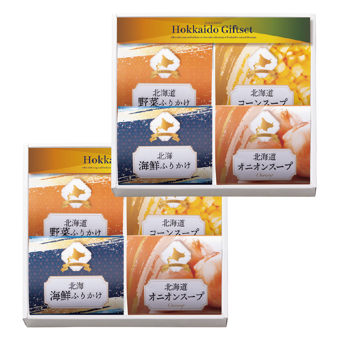 付属品、セット内容: 北海道コーンスープ(16.5g×2)×2・北海道オニオンスープ(7g×2)×2・北海道産野菜ふりかけ(3g×3)×2・北海海鮮ふりかけ(3g×3)×2