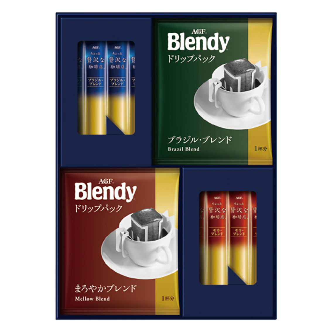 付属品、セット内容: 「ちょっと贅沢な珈琲店」スティックブラック ブラジル・ブレンド2g×7、「ちょっと贅沢な珈琲店」スティックブラック モカ・ブレンド2g×7、「ブレンディ」ドリップパック ブラジル・ブレンド7g×2、「ブレンディ」ドリップパック まろやかブレンド7g×2