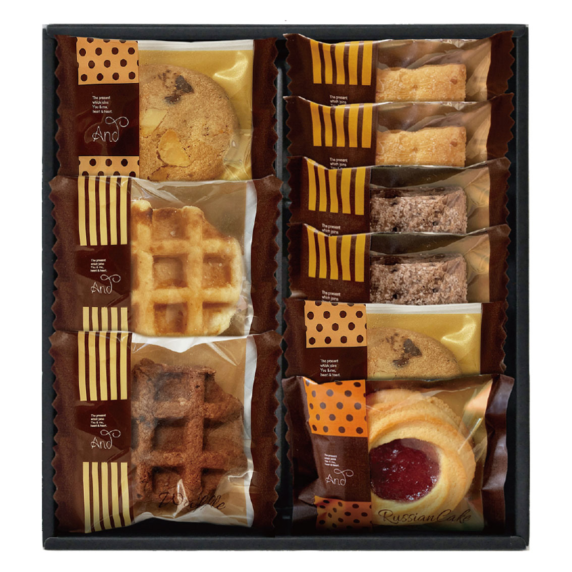 ブルーベリージャムをトッピングした甘酸っぱいロシアケーキ、食感にアクセントをつけた、程よい甘さのプレーンワッフル、やわらかな生地に、カリカリとした食感がアクセントのチョコレート風味のチョコワッフル、パイ、クッキーなどを詰め合わせ多こだわりのギフトです。