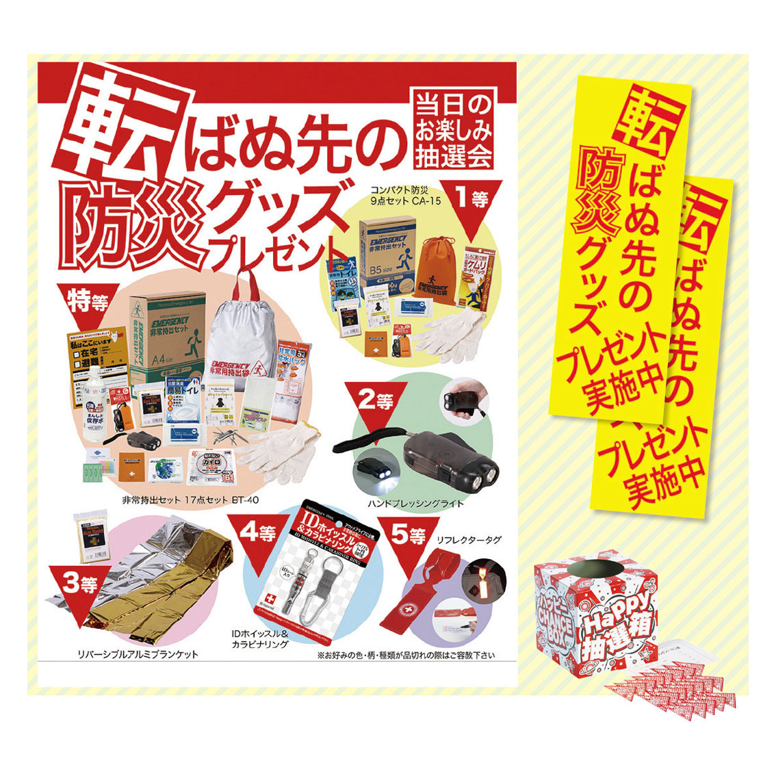付属品、セット内容: 特等:非常持出17点セット×1、1等:コンパクト防災9点セット×2、2等:ハンドプレッシングライト×3、3等:リーバシブルアルミブランケット×4、4等:IDホイッスル&カラビナリング×10、5等:リフレクタータグ×30、抽選用スピードくじ×50、抽選箱・明細表・A3ポスター×1