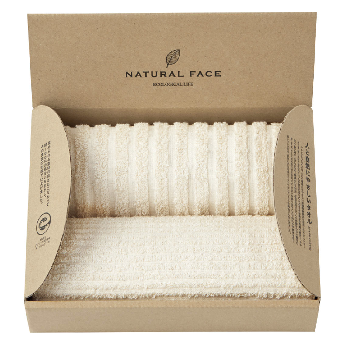 ナチュラルフェイスは人にも環境にもやさしい優木精練製法を採用したタオルシリーズです。求められる素材のよさにこだわって綿100%の風合を生かし、そのままの生成りで仕上げました。”