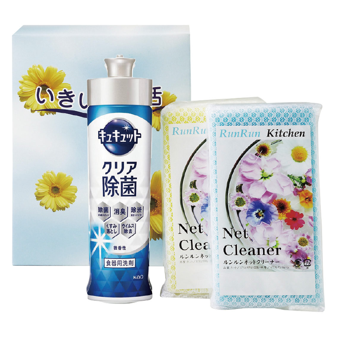 付属品、セット内容: 花王キュキュットクリア除菌220ml・ルンルンネットクリーナー2P(ペトナム)(ピンク・ブルー・イエローのアソート)