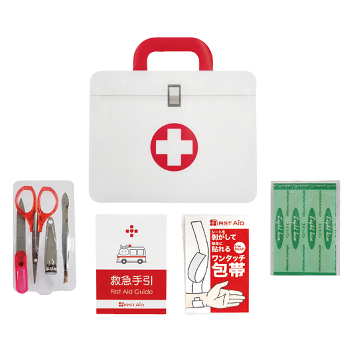 付属品、セット内容: ジッパーポーチ・絆創膏5P(日本)・ワンタッチ包帯(日本)・はさみ・爪切り・爪やすり・毛抜き・救急手引(日本)