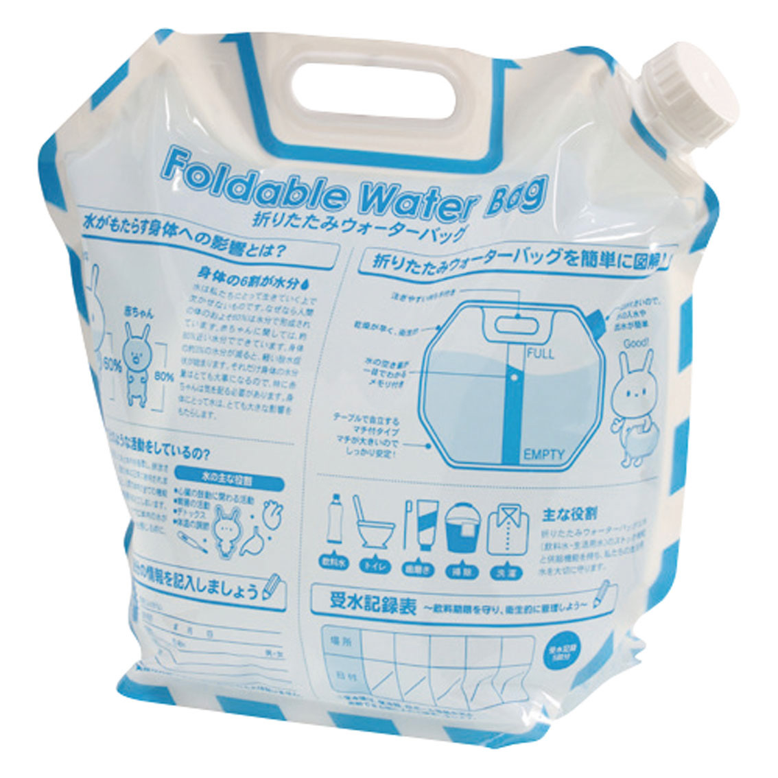 水の役割・水の確保の手引きなど役立つ情報をプリントした給水バッグです。