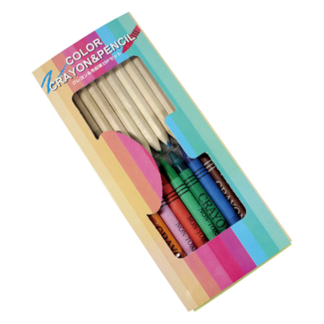 コンパクトサイズのクレヨン(9本)、色鉛筆(10本)が入ったお絵かきに便利なセット。お子様への記念品などにピッタリです。