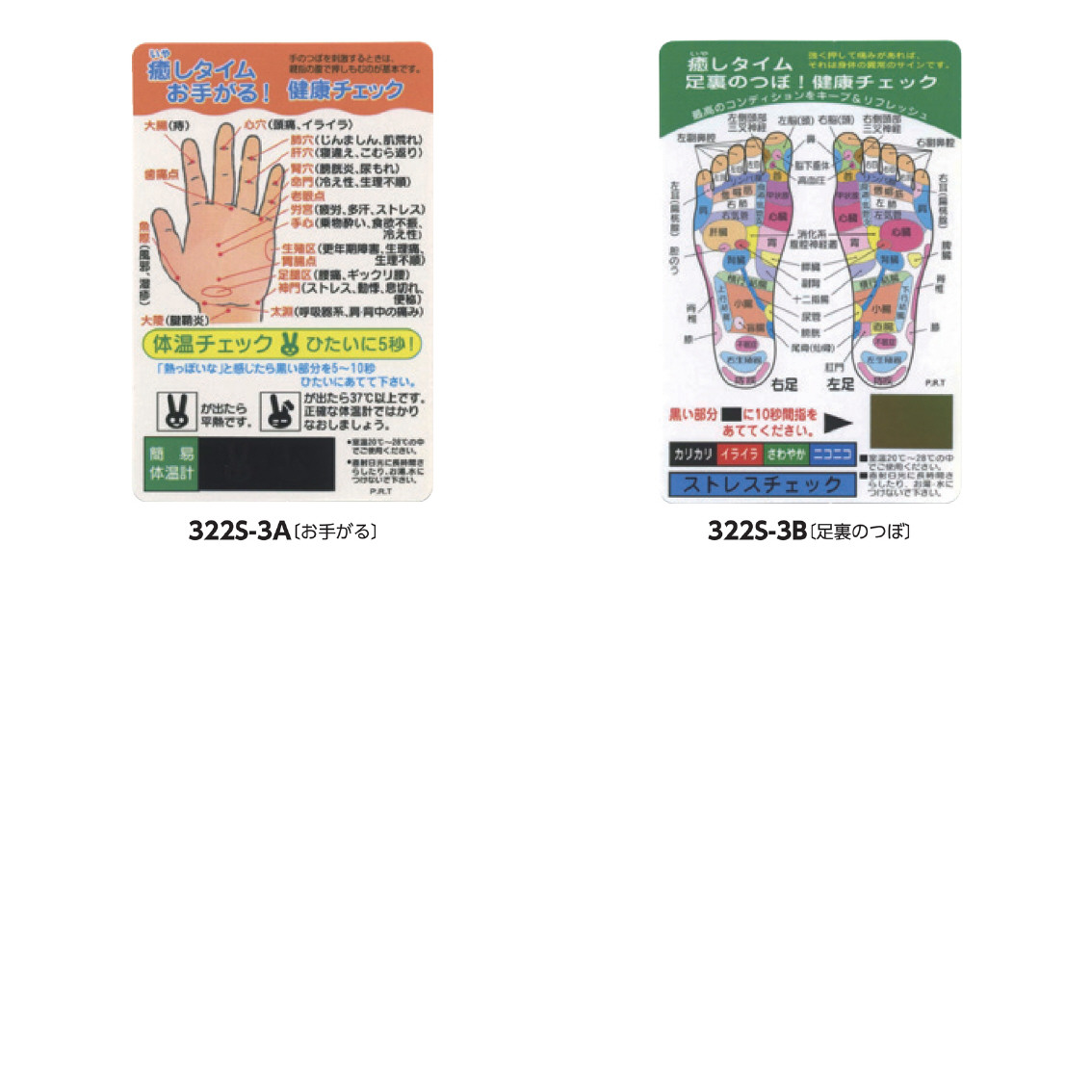 手のひらのつぼが一目でわかる簡易体温計付きカードと、足裏のつぼが一目でわかるストレスチェックカードです。