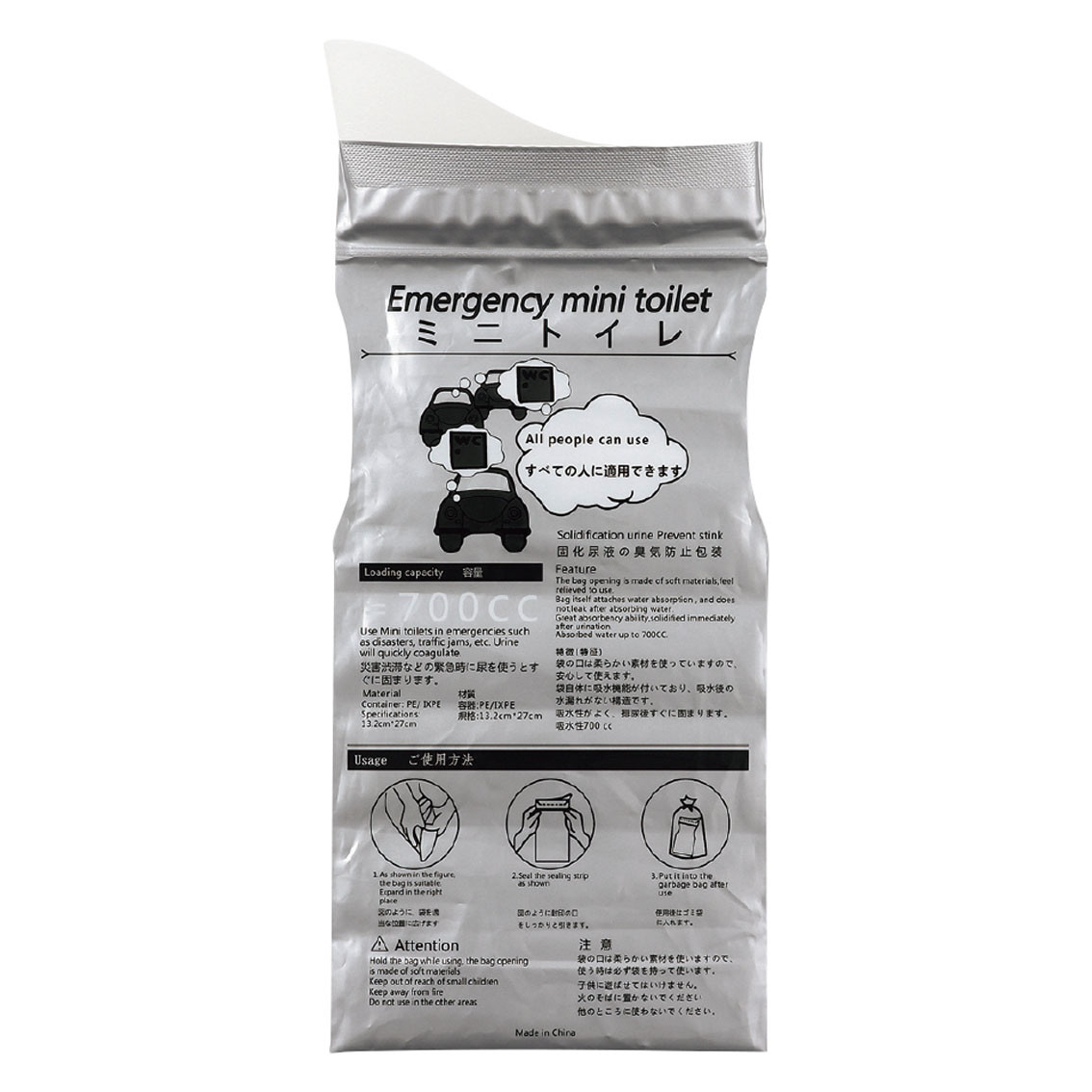 700mlの大容量であらゆる状況に対応できます。男女兼用の設計です。袋自体に吸水機能がついているので、吸水後の水漏れがない構造になっています。吸水性がよく、排尿後すぐに固まります。ポリマーを使用しているので臭いを消して、飛び散らないジェル状に変わります。災害時