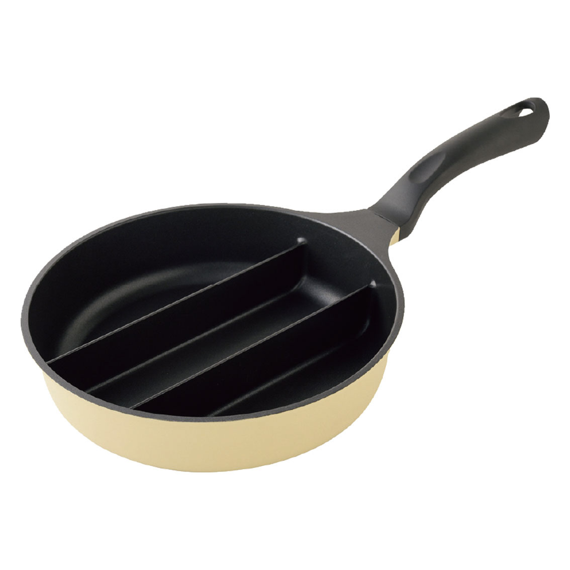 焼き場所が3つあるフライパンで、まん中は卵1個で玉子焼きを作るのに適した幅の5.5cmでお弁当にちょうどいいサイズです。フライパンのサイズは20cmの小ぶりで、仕切りの高さが3cmなので、汁物が隣に移りにくくゆでることもできます。