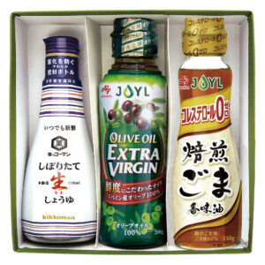 - 味の素エクストラバージンオリーブオイルと焙煎ごま香味油&キッコーマンしぼりたて生しょうゆセット